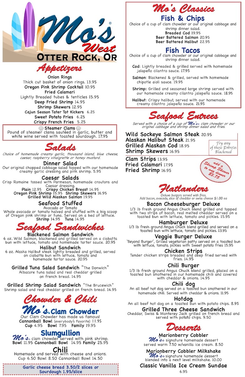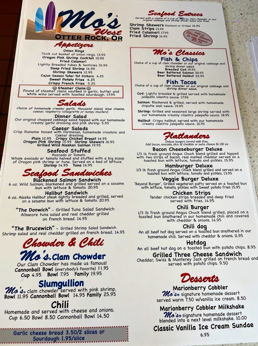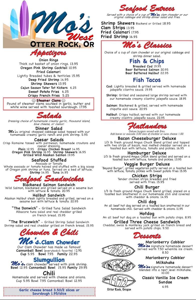 When you’re craving fresh, flavorful seafood with a breathtaking view, Mo's Seafood & Chowder Menu offers just what you need. Located at the scenic Devils Punchbowl in Otter Rock, Oregon, this cozy spot invites you to dive into a menu filled with classic seafood dishes that capture the essence of coastal dining. From hearty clam chowder to perfectly grilled fish and crispy calamari, each dish is crafted to highlight the natural flavors of the sea. Whether you're enjoying a relaxing meal on the patio or grabbing a quick bite to go, there’s something for every seafood lover to enjoy. The friendly atmosphere and stunning surroundings make it the perfect spot for both locals and visitors looking to indulge in the best of the Oregon coast.