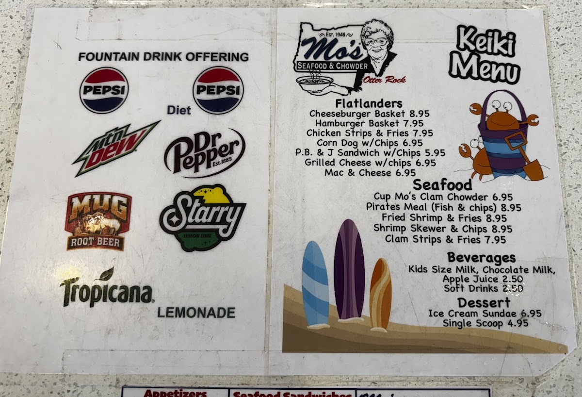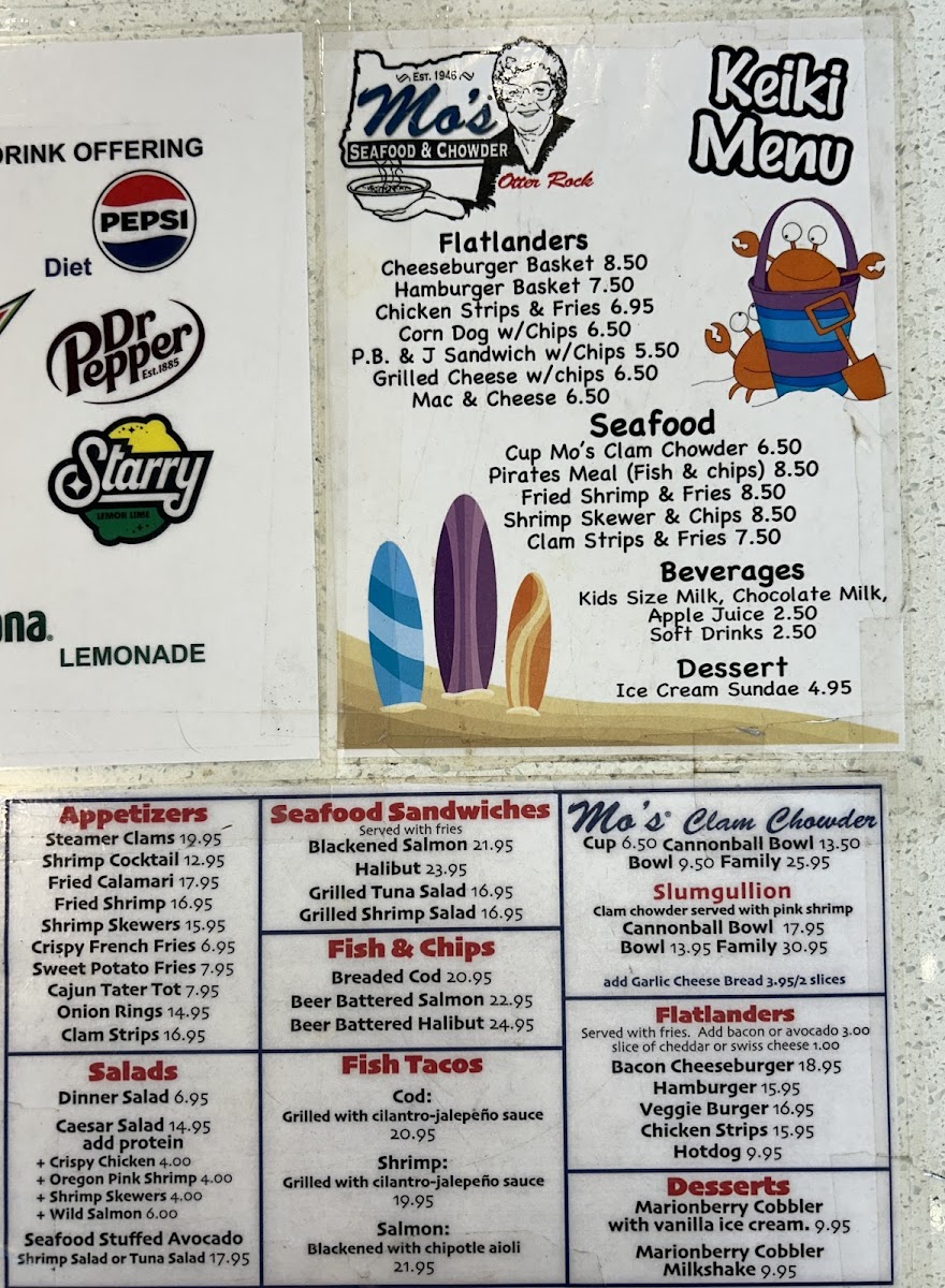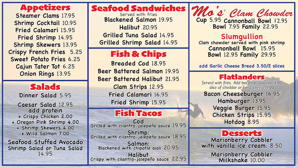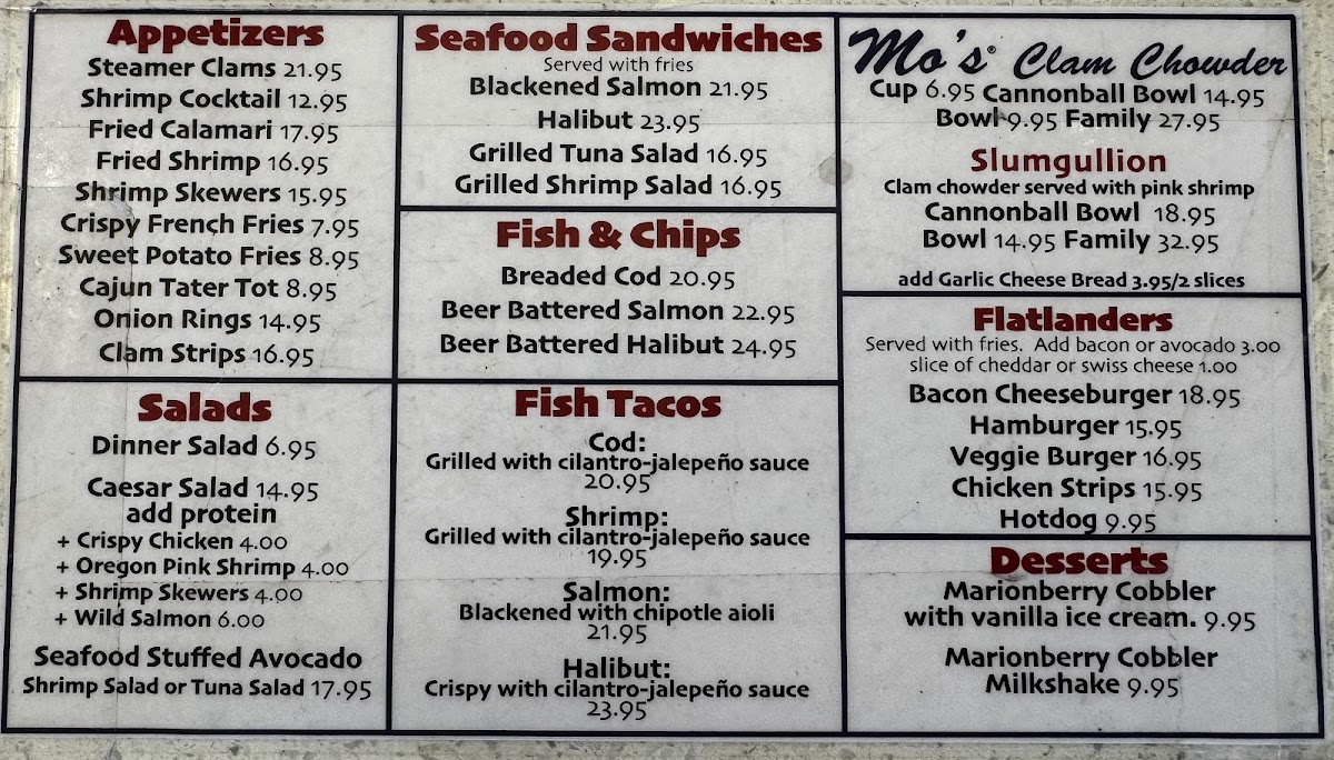 When you’re craving fresh, flavorful seafood with a breathtaking view, Mo's Seafood & Chowder Menu offers just what you need. Located at the scenic Devils Punchbowl in Otter Rock, Oregon, this cozy spot invites you to dive into a menu filled with classic seafood dishes that capture the essence of coastal dining. From hearty clam chowder to perfectly grilled fish and crispy calamari, each dish is crafted to highlight the natural flavors of the sea. Whether you're enjoying a relaxing meal on the patio or grabbing a quick bite to go, there’s something for every seafood lover to enjoy. The friendly atmosphere and stunning surroundings make it the perfect spot for both locals and visitors looking to indulge in the best of the Oregon coast.